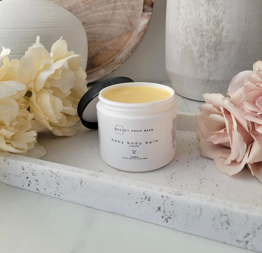 - All-Natural Baby Body Balm from ‘Beauty from Bees’- unscented, nutrient-rich balm gently soothes dry, chapped, irritated skin. The ingredients are mild and safe making it the perfect option right from birth.