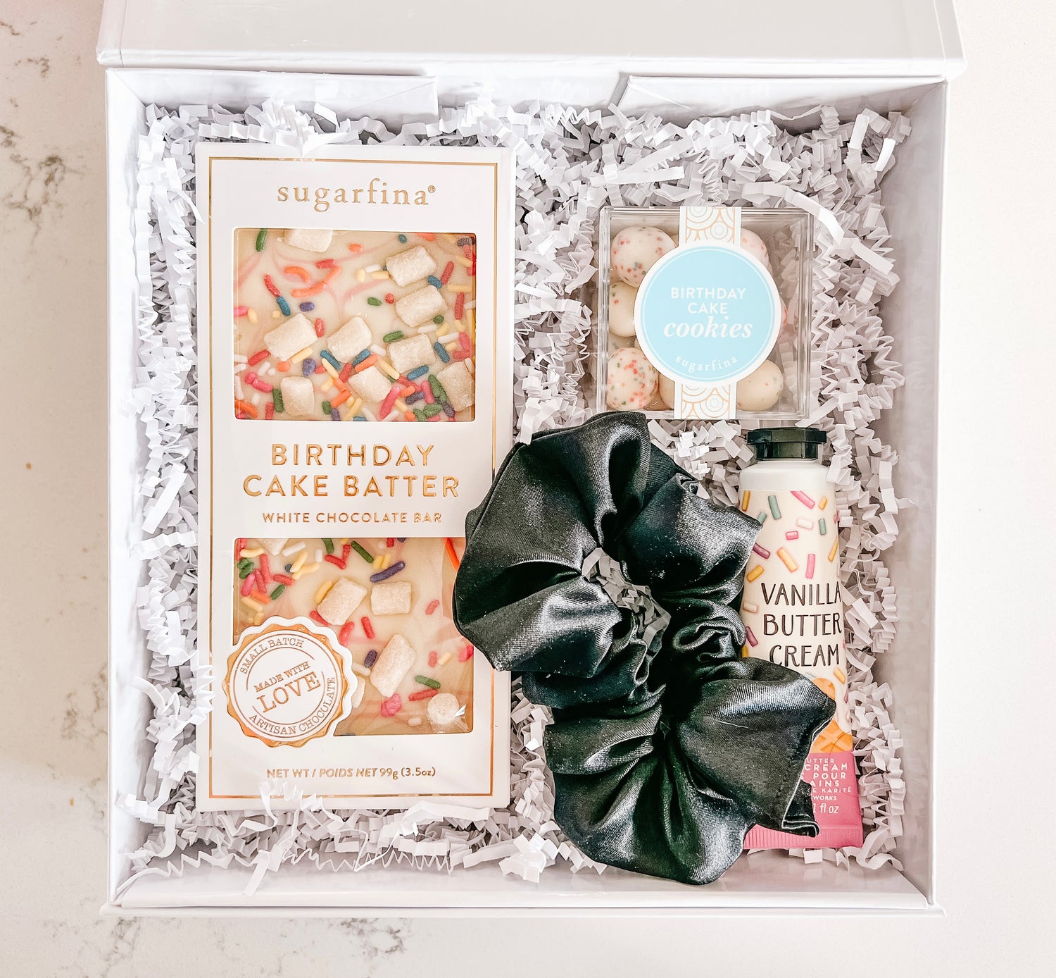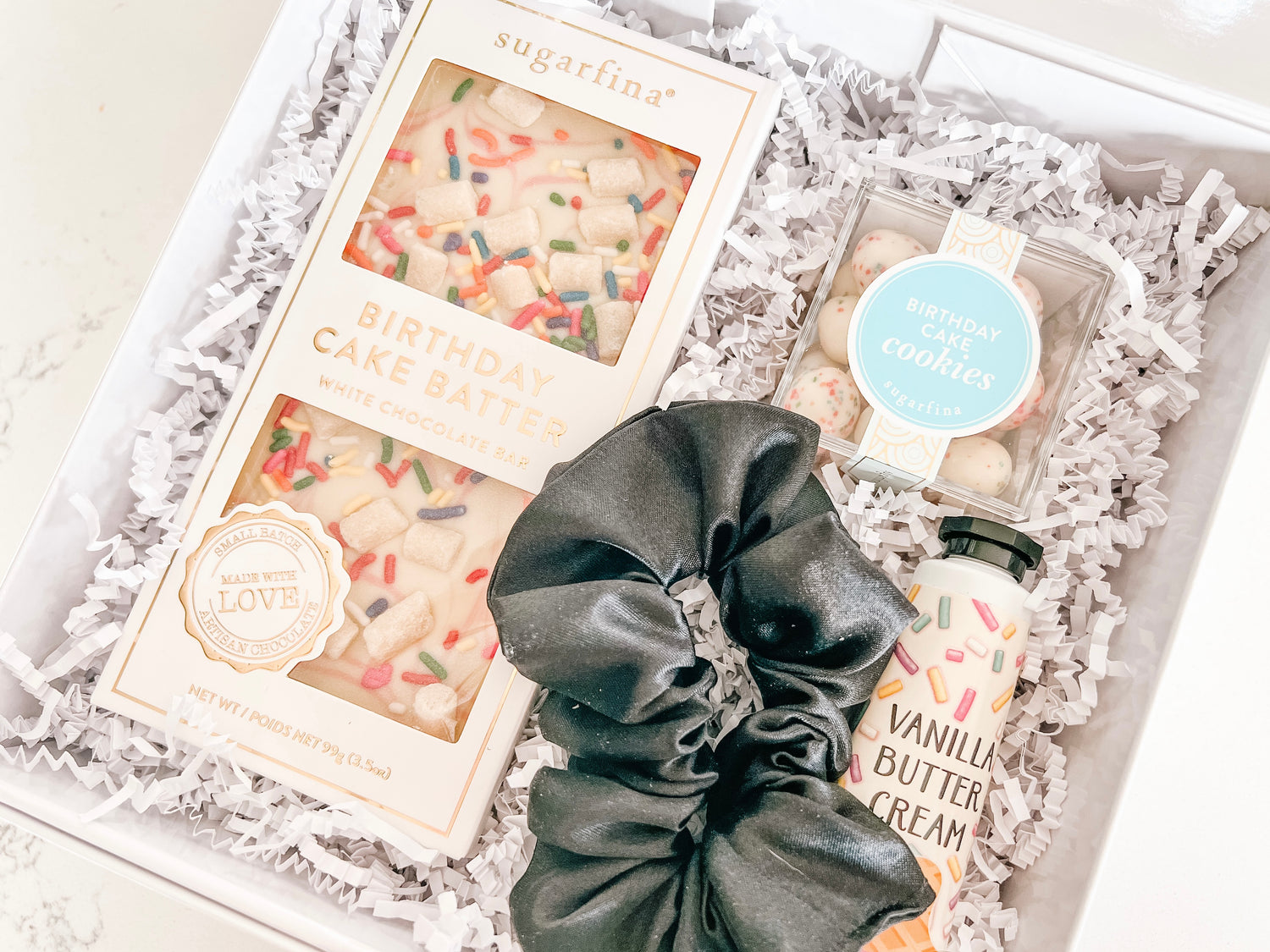 - Birthday Cake Cookies from 'Sugarfina' - crispy sugar cookie bites, dipped in decadent white chocolate and sprinkles
