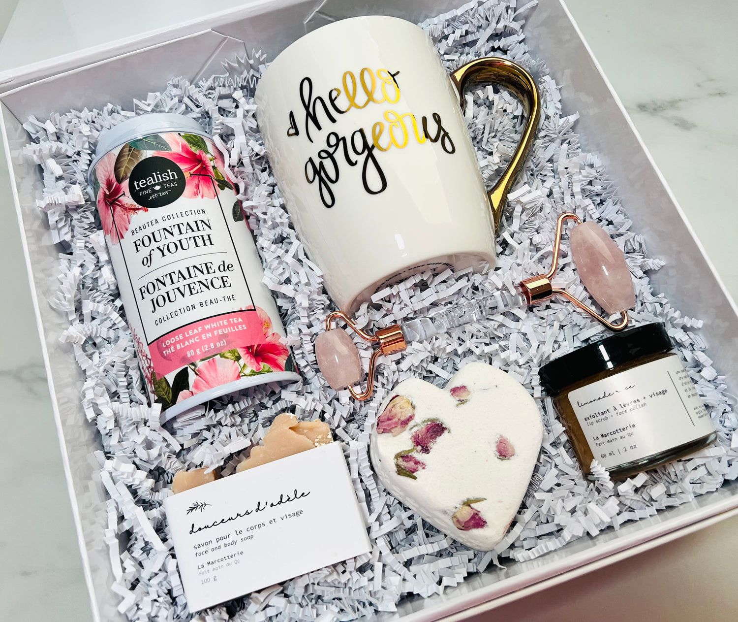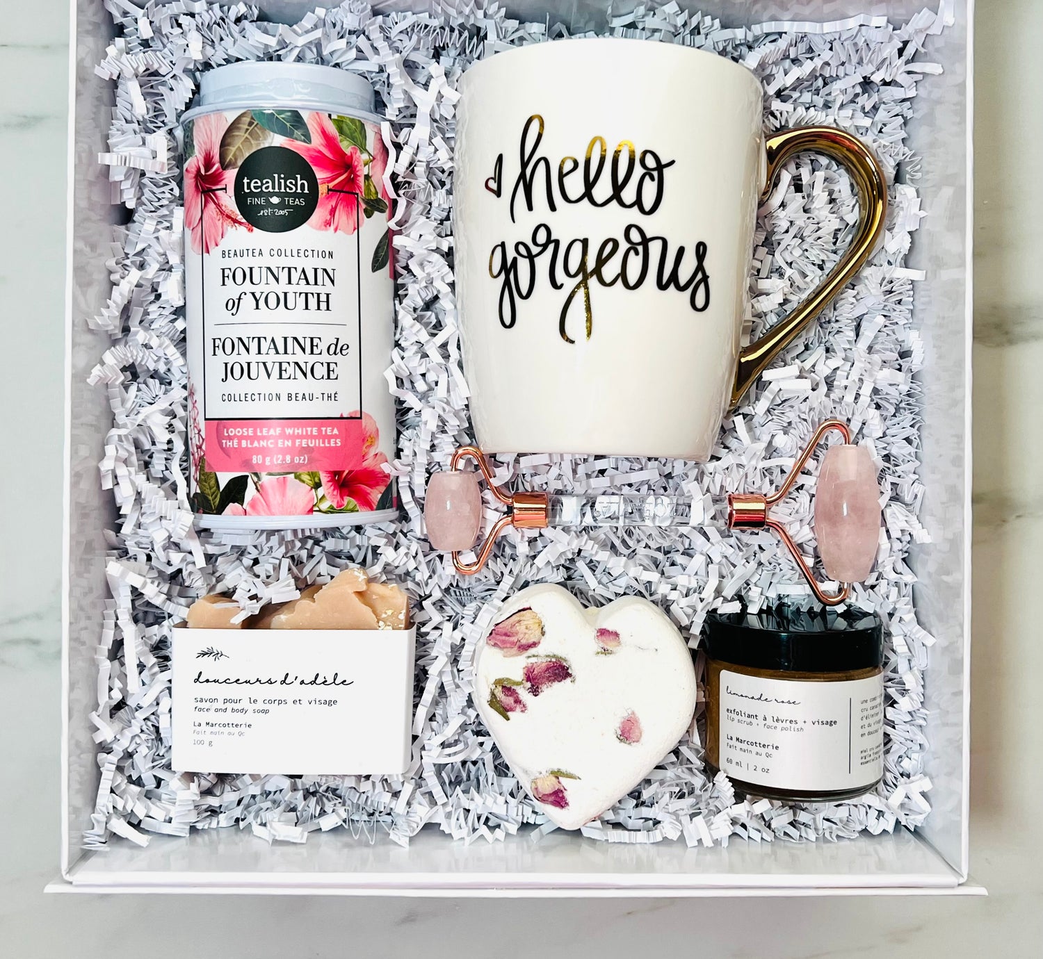Remind her how Gorgeous she is by providing her with these luxurious spa items that she can enjoy at home. Tea is good for the soul and the rose quartz roller helps calm the skin after enhancing her skins natural glow with the Pink Lemonade Face Polish.