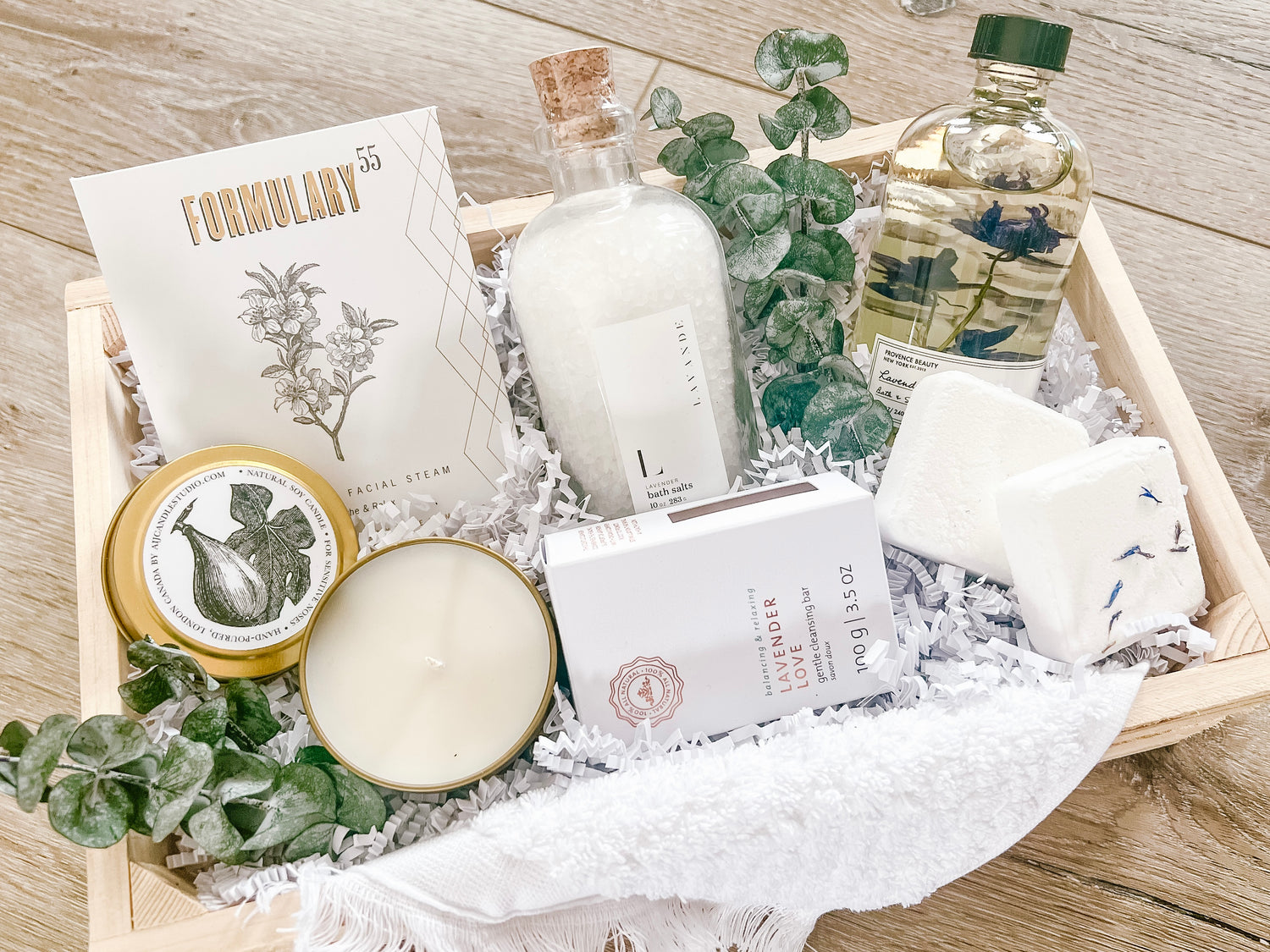 This gift comes in a wood box and includes all the ingredients for the perfect pampering self-care ritual, complete with: